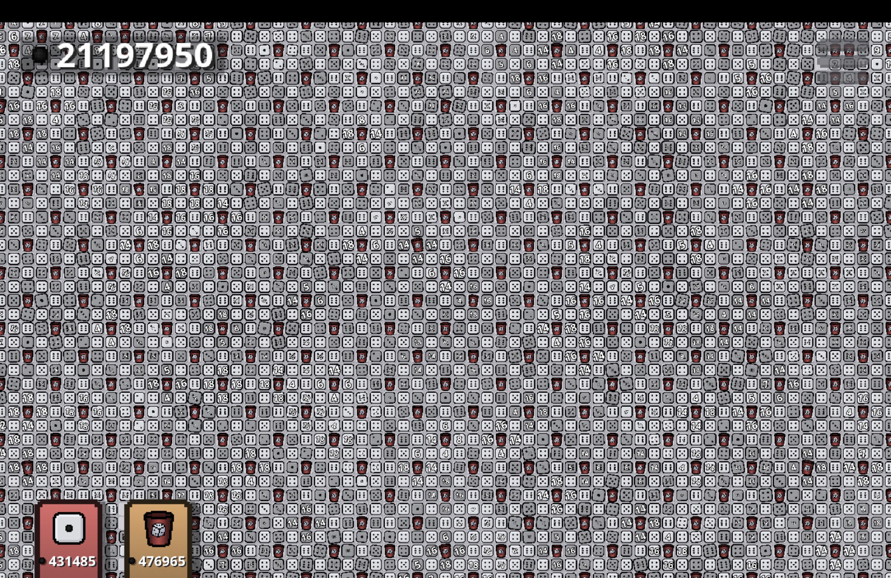 Ive seen people mention it but ive not seen anybody do it yet ima complete the game via filling in every single square. Been busy recently so haven't been able to finish just yet but ive done some math and its very possible. I'm using the design recommended by ^densch in the comments because it seems to be the best from my testing(also i like the way it looks). Currently I have made a 13x13 incomplete design(haven't finished the edges), 13 being the amount of auto rollers counted diagonally at the edge(think of it as a rotated square ). It doesn't all fit on screen and its' a bit laggy(don't even wna talk abt what it sounds like lmao). Anyways that's all and ill update once it gets a bit bigger, cya :) TL;DR - Dice go brrr, I will try to roll all dice that I can, will keep updated